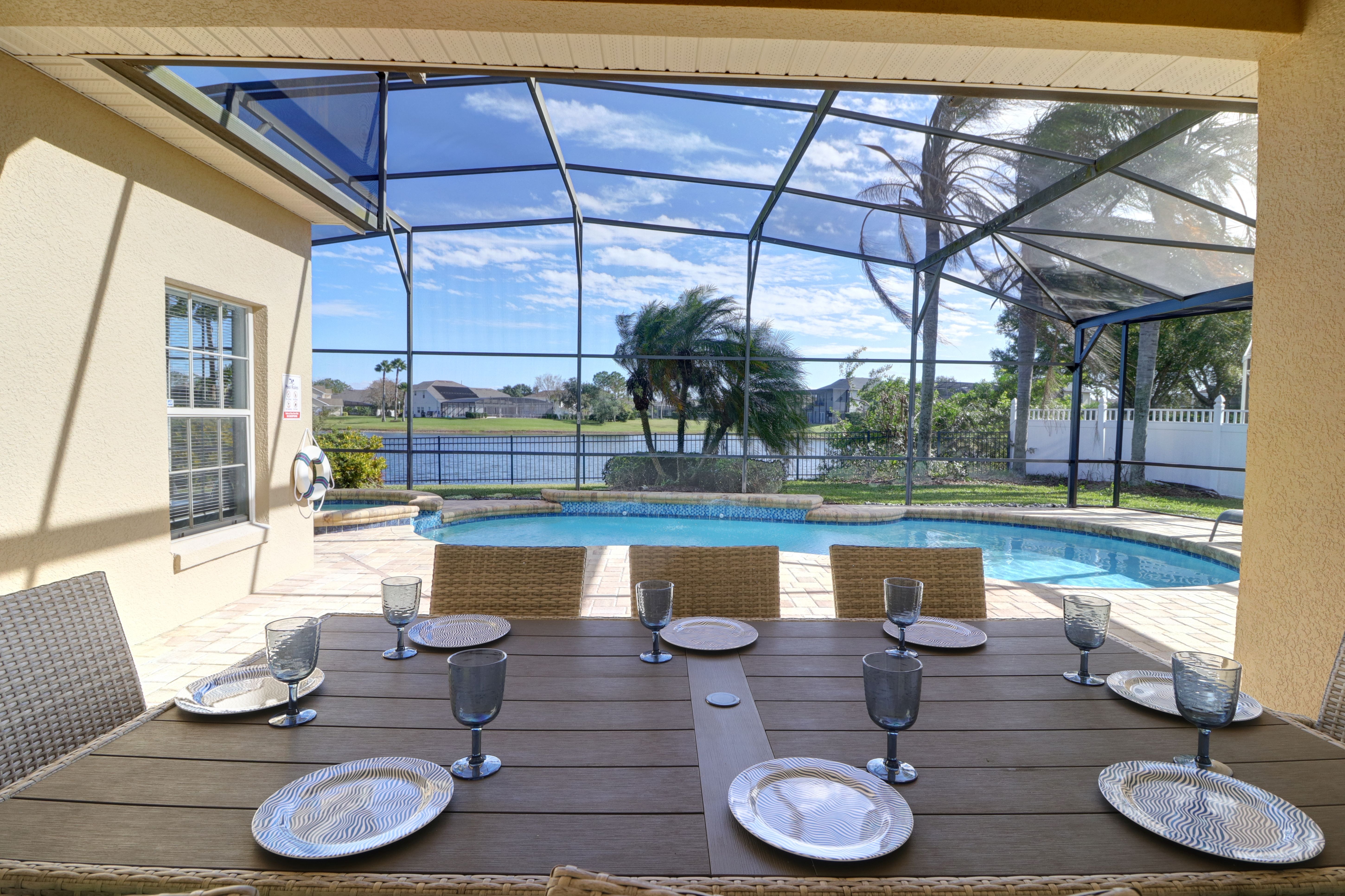Extended Lakefront Screened Pool deck has 6 sunloungers (plus 2 sunloungers outside screen)